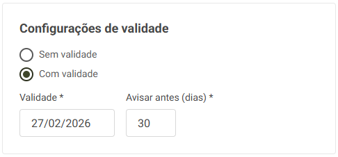 Caso o documento tenha validade, selecione a opção Com validade para informar a data. No campo Avisar antes (dias), defina a quantidade de dias de antecedência em que o responsável será notificado.