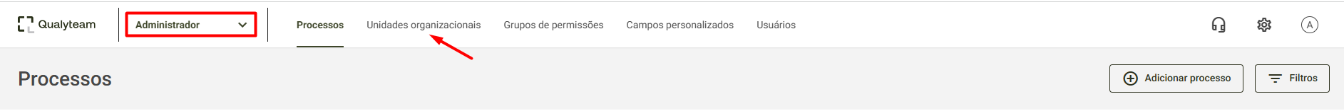 Para excluir uma Unidade Organizacional, acesse o Menu Administrador ou o ícone de engrenagem e, em seguida, clique em Unidades Organizacionais: