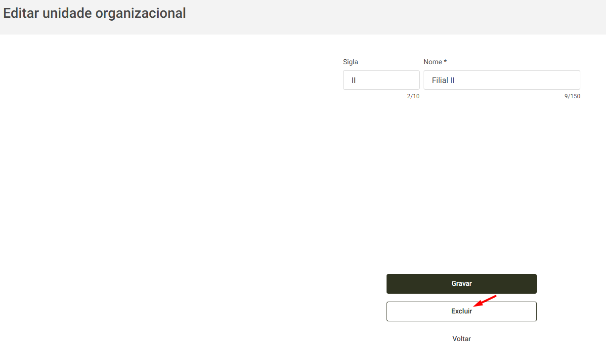 O sistema permite excluir uma Unidade Organizacional. Para isso, é necessário que o usuário tenha a permissão Excluir unidades organizacionais habilitada em seu grupo de permissões, conforme detalhado neste artigo.