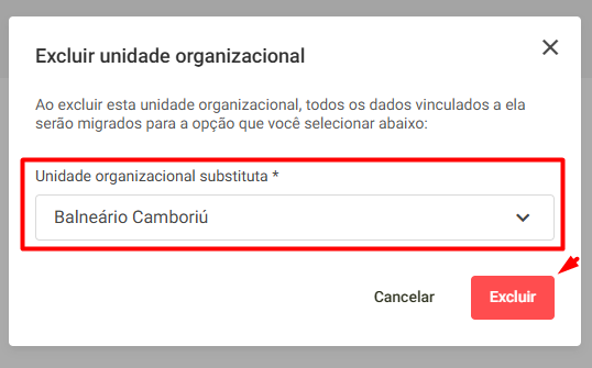 Ao clicar em Excluir, o sistema validará a exclusão e realizará a migração dos dados para a Unidade selecionada: