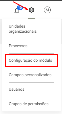 - No módulo Gestão de Não Conformidades, clique na engrenagem no canto direito do menu superior e clique na opção Configuração do módulo: