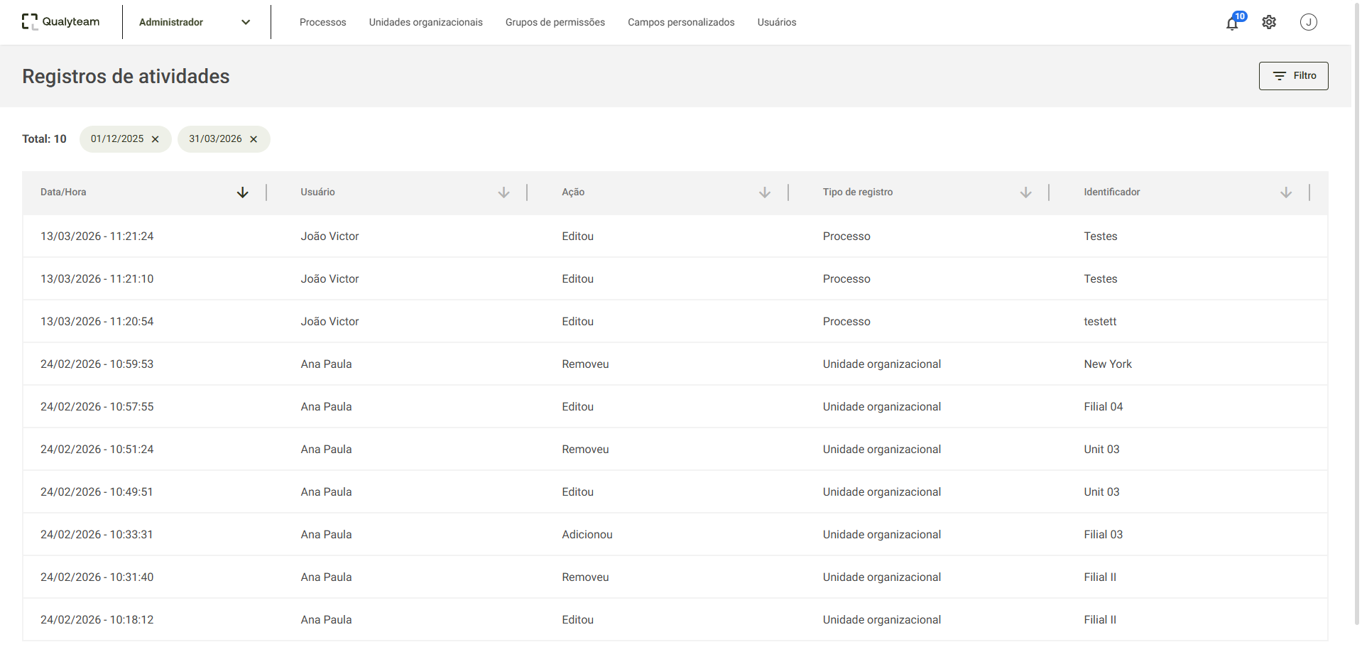 Abrirá a tela de registros de atividades, onde você poderá filtrar por: