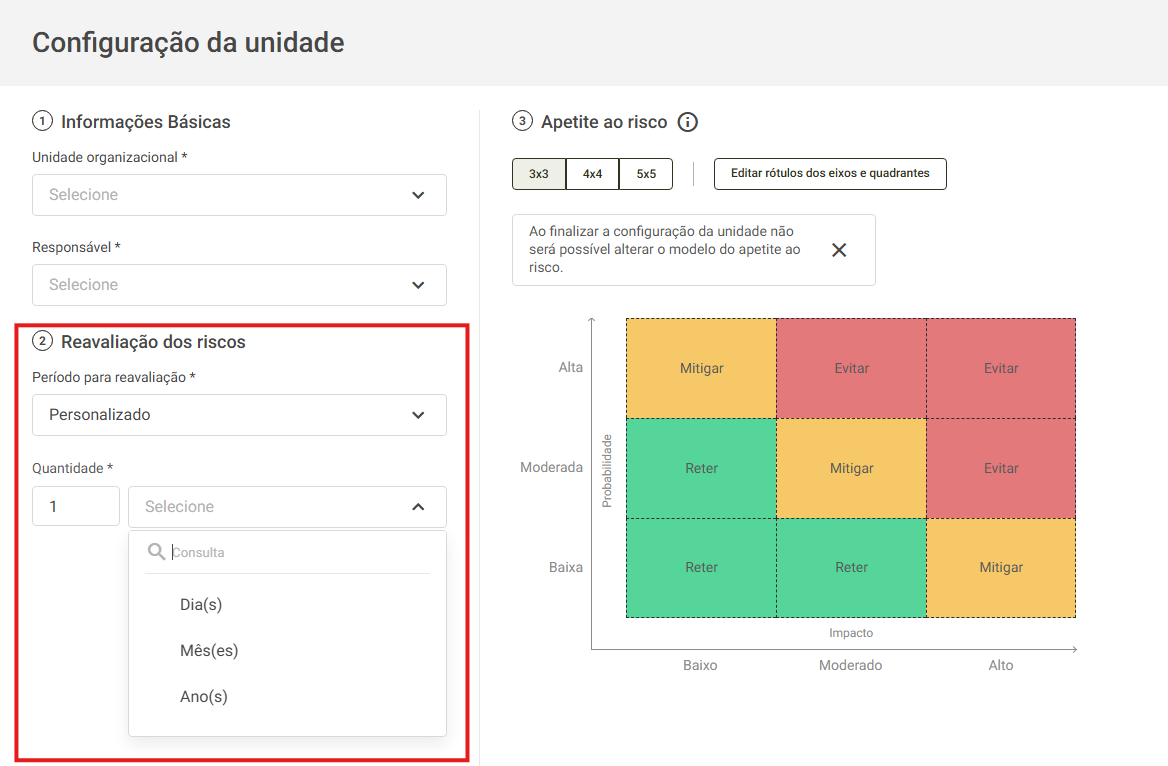 Agora é possível selecionar um prazo personalizado para reavaliação de riscos, selecionando também quantos dias, meses ou anos até o período de reavaliação.