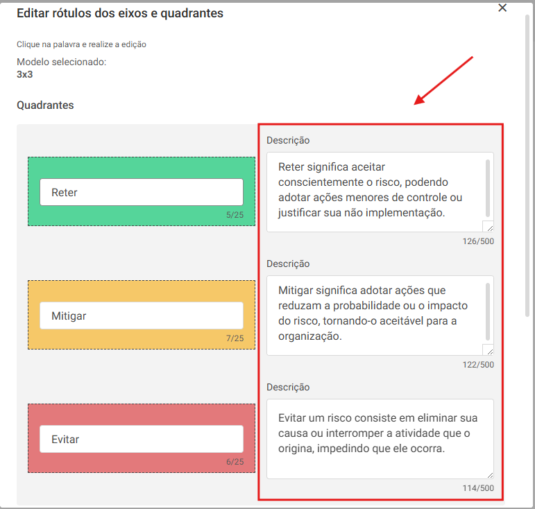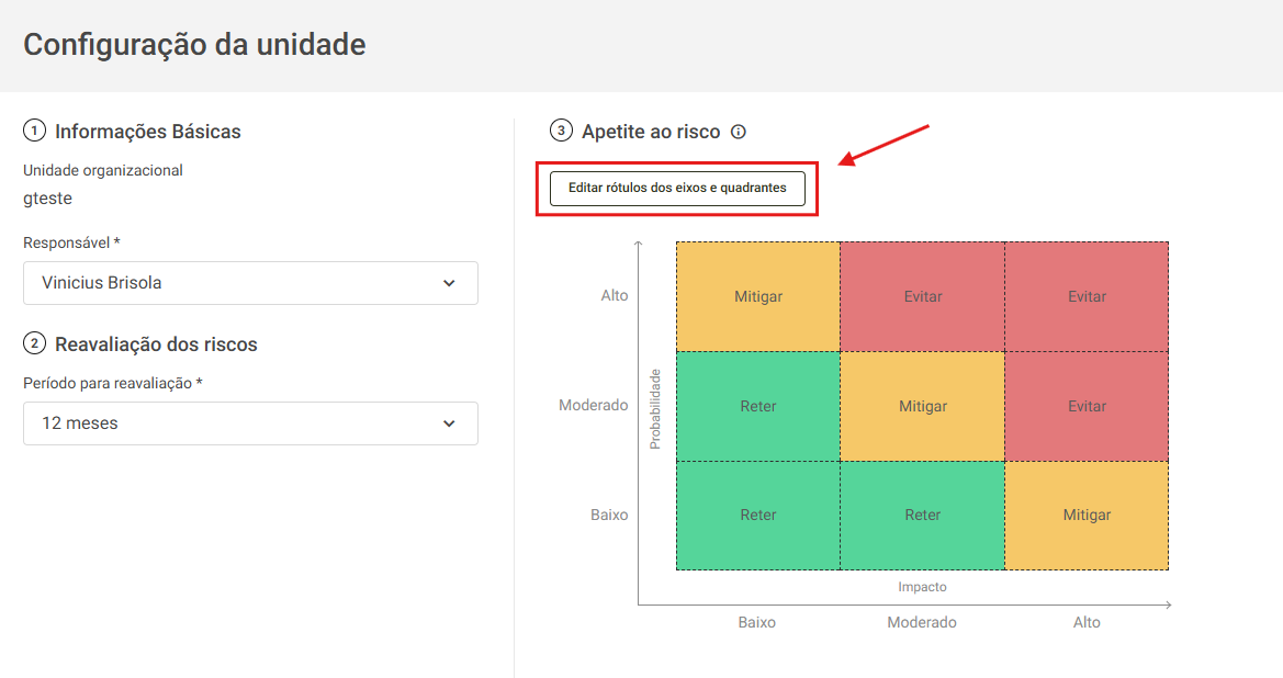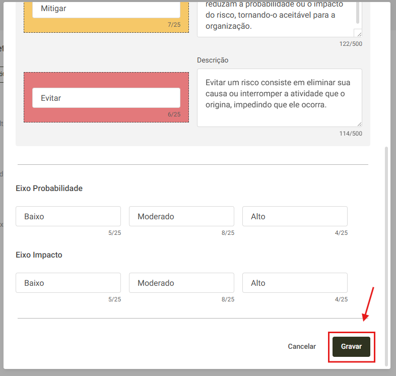 Agora é possível incluir descrições personalizadas para cada nível da matriz de risco (como “Reter”, “Mitigar” e “Evitar”), facilitando o entendimento e a padronização das análises.